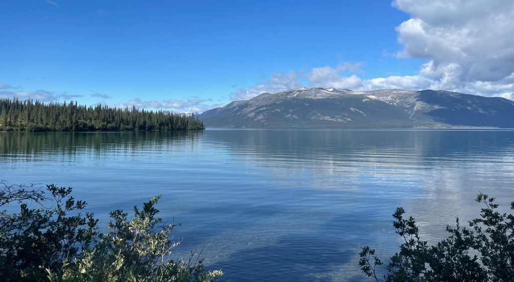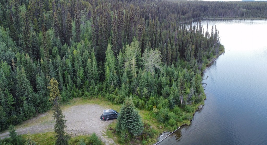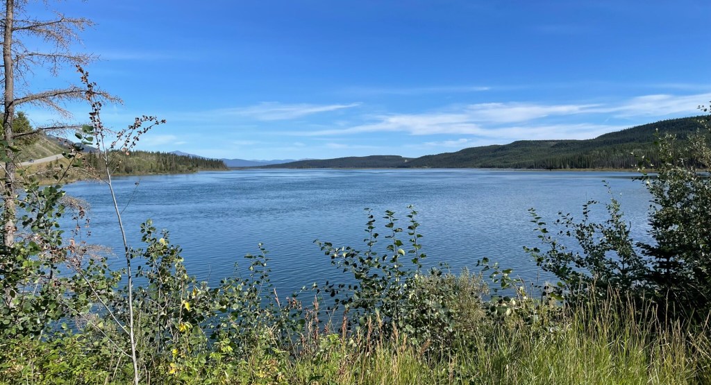 „Wir könnten doch auch über die S Canol Road und den Campbell Hwy. nach Watson Lake fahren“ kommt der Vorschlag vom Navigator, kaum dass wir zurück auf dem Alaska Hwy. sind. Kurz überlegen wir, kommen aber schnell zu dem Schluss, dass wir den Verlauf des „Alaska“ von hier bis Watson Lake schon gefahren sind und biegen in Johnsons Crossing auf die Schotterstraße ab. (Als ob wir in letzter Zeit nicht genug auf Schotter unterwegs gewesen wären…) Natürlich besorgt Sabine vorher noch die leckeren Zimtstücke von der Bäckerei die wir schon auf dem Weg nach Norden genossen haben. Am Sidney Lake ist dann für heute Schluss.