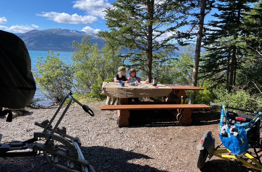 Das Geburtstagsfrühstück am 5.8. dauert etwas länger. Nicht nur, weil es so gut schmeckt, sondern auch weil viele liebe Freunde und Verwandte anrufen um persönlich zu gratulieren. Das tut so gut, auch in der Ferne mal wieder alle zu sprechen! Da kommt bei Clemens schon ein wenig Heimweh auf. Wir halten am Fähranleger und Sabine geht mal fragen ob vielleicht morgen oder übermorgen oder noch später ein Platz auf der Fähre nach Skagway frei ist. Sie kann es kaum glauben, als die Antwort der netten Frau hinter dem Tresen kam: „Klar wann wollt ihr denn fahren, Tickets habe ich noch für alle Tage“. Sie bucht die Mittagsfähre am 6.8.! Dann erkunden wir die Gegend um Haines und sind zum Kaffee im Chilkat State Park. Guter Kaffee, tolle Aussicht, phantastisches Wetter und eine liebe Familie, da ist bei Clemens das Heimweh wieder ganz schnell verschwunden.