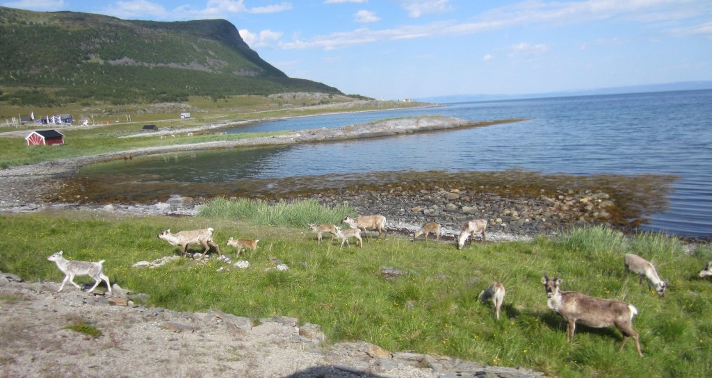 Dann begegnen wir auch noch Rentieren, neben und auf der Straße.