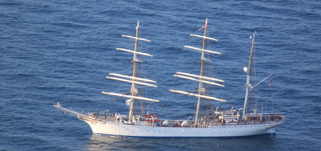 Am Nordkapp angekommen bekommen wir den ersten Parkplatz in der Reihe vieler Womo‘s, die hier übernachten wollen…Glück gehabt! Unten im Nordmeer grüßt die Statsraad Lehmkuhl.