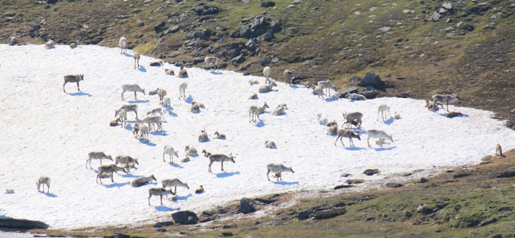 Rentiere sind scheinbar scharf auf Schnee. Hier hat sich die Herde auf einem Schneefeld versammelt.