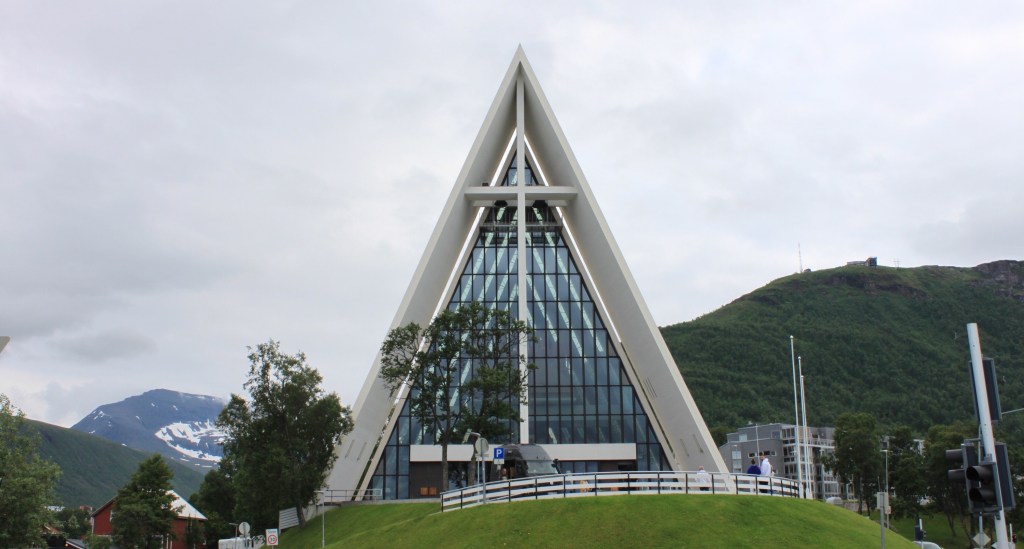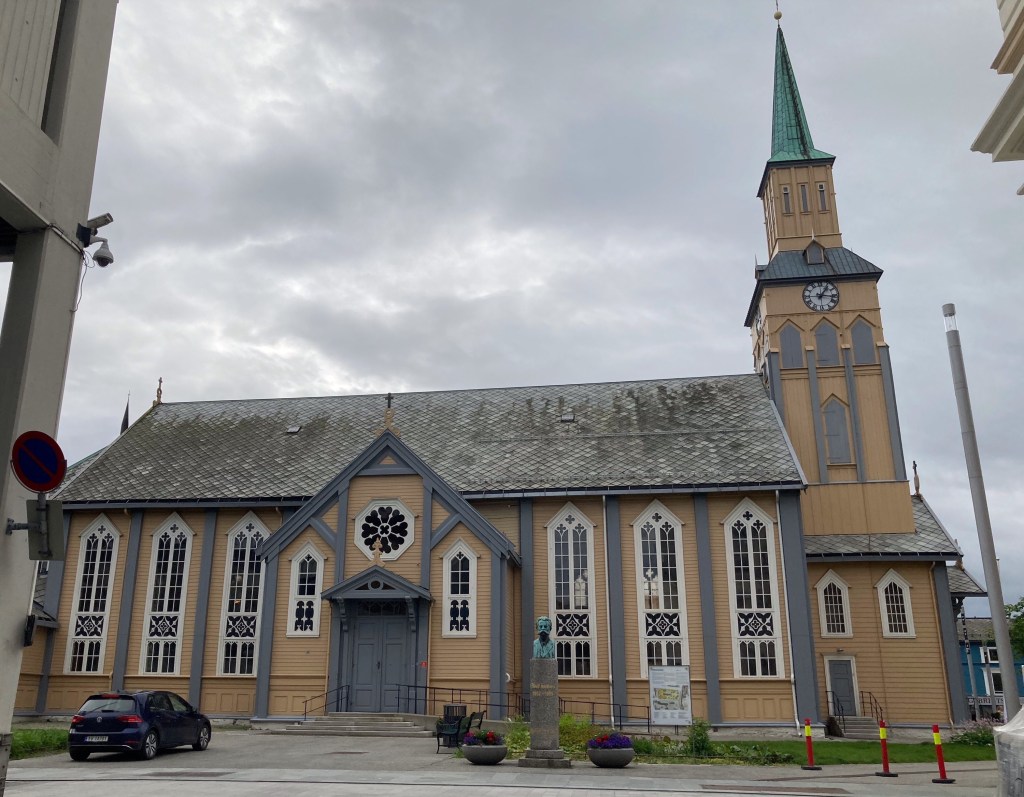 Heute Morgen ist es bedeckt und angenehm kühl. Wir fahren zuerst in die Innenstadt und schlendern durch die Fußgängerzone. Viele alte Häuser entdecken wir nicht. Tromsö ist, wohlwollend ausgedrückt, eine bunte Mischung aus wenig alter Bausubstanz und viel modernen (häßlichen?) Gebäuden. So richtig gut gefällt uns das nicht.