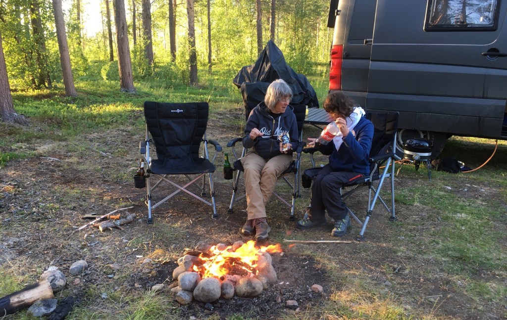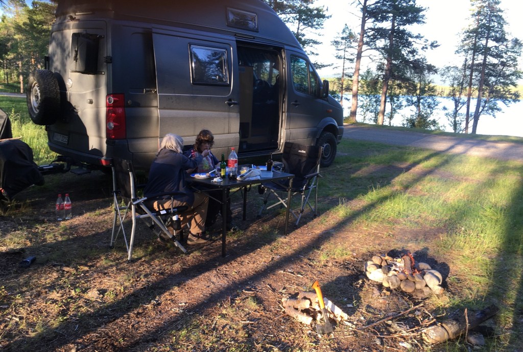 Auf Schotter geht es weiter bis nach Stalon, hier treffen wir auf den Vildmarksvägen, dem wir nun weiter folgen wollen. Erstmal gibt es heute geschmorte Zucchini. Vor dem Essen kommen noch nette Schweden vorbei und bringen uns eine Übersichtskarte des gesamten Vildmarksvägen mit Beschreibungen der Sehenswürdigkeiten. Die Insidertipps, die wir direkt beim klönen bekommen, werden wir in den nächsten Tagen „abarbeiten“. Wieder mal eine nette Begegnung und ein lohnenswerter Austausch!