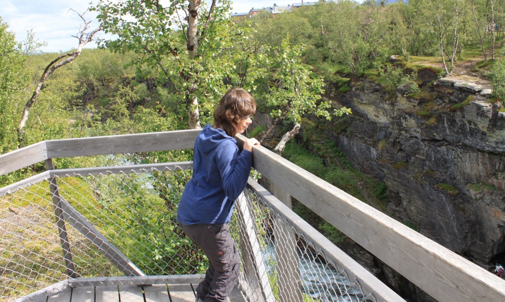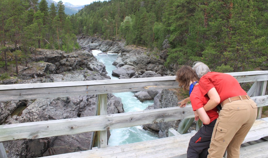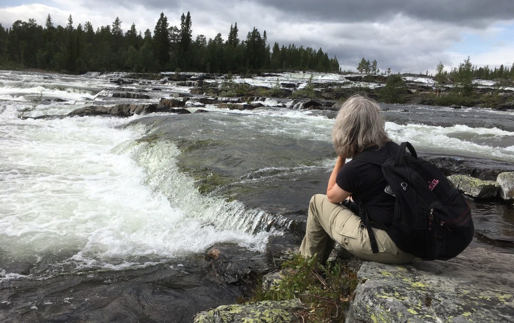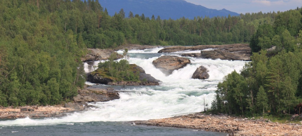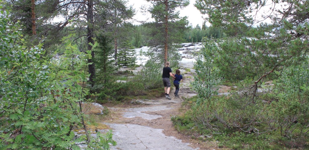 Der gesamte Vildmarksvägen beschreibt einen Halbkreis von Vilhelmina im Norden bis Strömsund im Süden und stößt, so in der Mitte, an die norwegische Grenze. Wir steigen zwischendurch bei Stalon ein. Unser erster Wasserfall sind eher Stromschnellen. Dafür sind die Treppenartigen Fälle des Trappstegsforsen sehenswert. Auch Lina können wir zu einer kleinen Wanderung überreden.