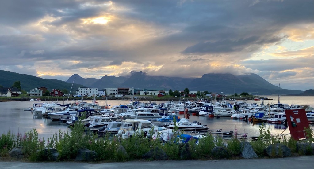 Unser Nachtlager schlagen wir heute im Yachtclub von Harstad auf. Wir fragen einige Bootsleute, ob wir hier über Nacht stehen dürfen. Die Antwort ist immer die gleiche, „aber klar, hier stehen öfter Wohnmobile“. So haben wir heute einen schönen „Vorgarten“ mit Yachten, Himmel und Bergen.