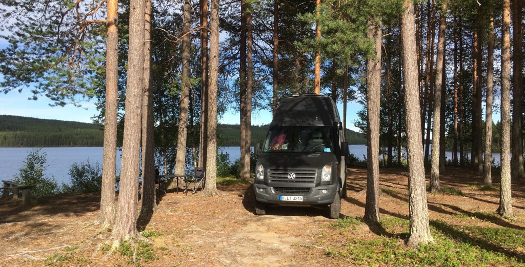 Sehr wenig Verkehr und viele Rentiere auf der Straße. Elche begegnen uns bisher keine. Einen netten Stellplatz finden wir am Badeplatz von Suddesjaur, irgendwo im schwedischen Gebirgsland. Hier gibt es nicht nur eine Badestelle im See, eine Toilette, eine Grillhütte und eine Feuerstelle, sondern auch das Feuerholz, alles kostenlos. Am Morgen kommt ein Mann mit Radlader und bringt eine ganze Radladerschaufel voll neues Holz und stapelt es an der Grillhütte auf. Toller Service!