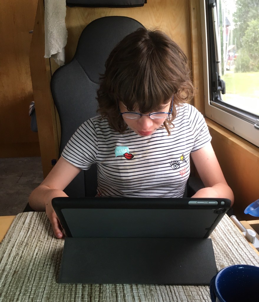 Heute fängt der Tag auf den Campingplatz von Töre erstmal ganz ruhig an. Nach dem Frühstück ist erstmal wieder Schule. Lina hat ihre Aufgaben zu erledigen.