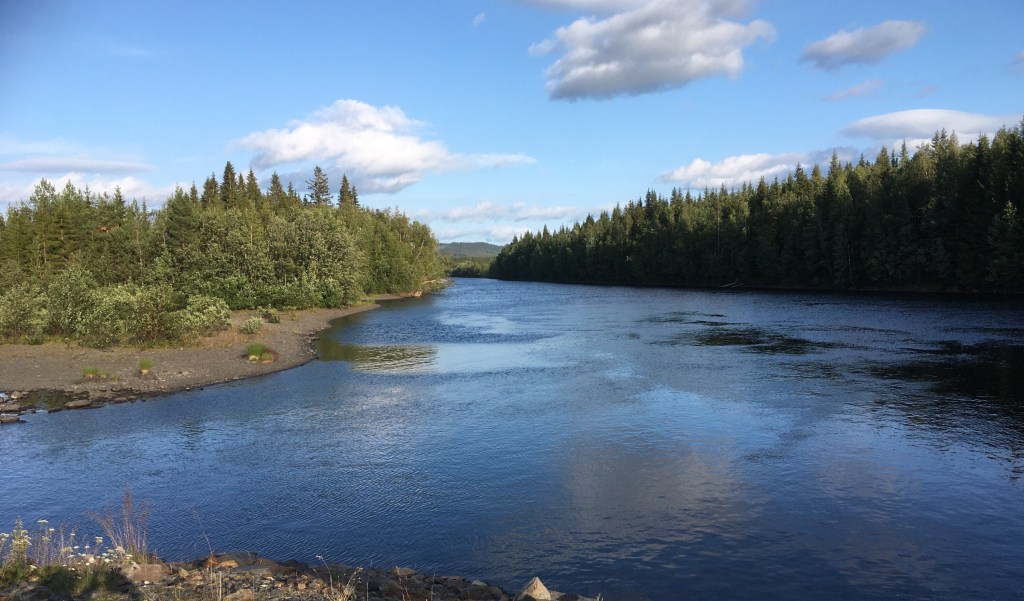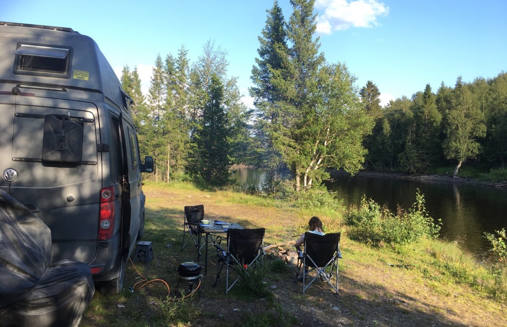Dann nutzen wir auch in Norwegen wieder die Neben- und Schotterstraßen und fahren weiter Richtung Namsos. Nun stehen wir so ca. 20 km davor auf einem Fischerparkplatz mit Grillhütte, Plumpsklo direkt am Namsen und lassen uns die Köttbullar mit frischem Potatismos und Lingonsylt vor dem Womo bei 26°C schmecken.