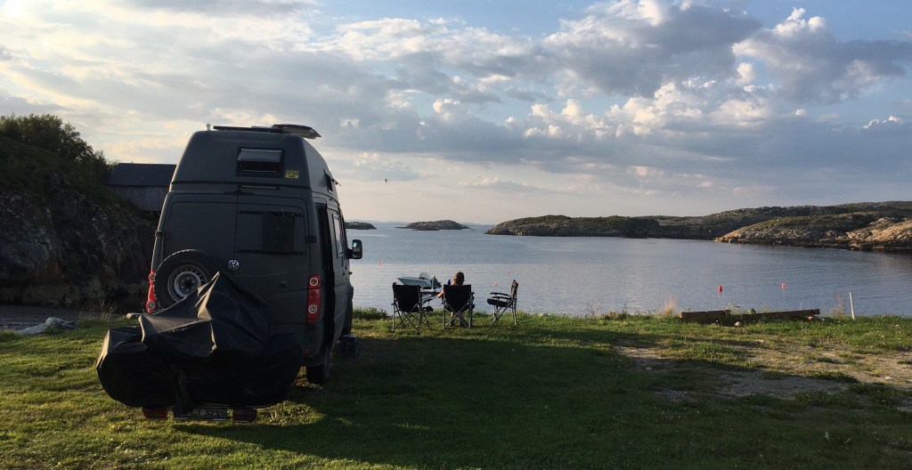 Im Velbinger steht, dass die vorgelagerte Insel Otterøya flach ist und sich für Fahrradtouren eignet. Wir machen uns auf den Weg. Über die Lokkarbrua kommen wir auf die Insel und finden Berge, enge in den Fels gehauene Straßen und steile Anstiege. Was wir nicht finden, sind fahrradtaugliche Wege und einen Stellplatz für die Nacht. Auf dem ersten stehen schon 3 Womos, und dann kommt erstmal irgendwie keine geeignete Stelle. An einem Hafen fragen wir nach einer Möglichkeit und erfahren, dass am Ende der Straße der Campingplatz im Frühjahr geschlossen hat, das Gelände aber zum Übernachten weiter genutzt wird. Wieder einmal kommen die besten Tipps von Einheimischen. Der Platz ist genial, das Wetter ist warm, das Essen ist lecker und der in Namsos gekaufte Rotwein rundet das Ganze perfekt ab. Wenn man so hier sitzt und genießt, wird uns wieder so richtig bewusst, wie gut das tut und wie entspannend eine solche Reise sein kann. Einfach toll.