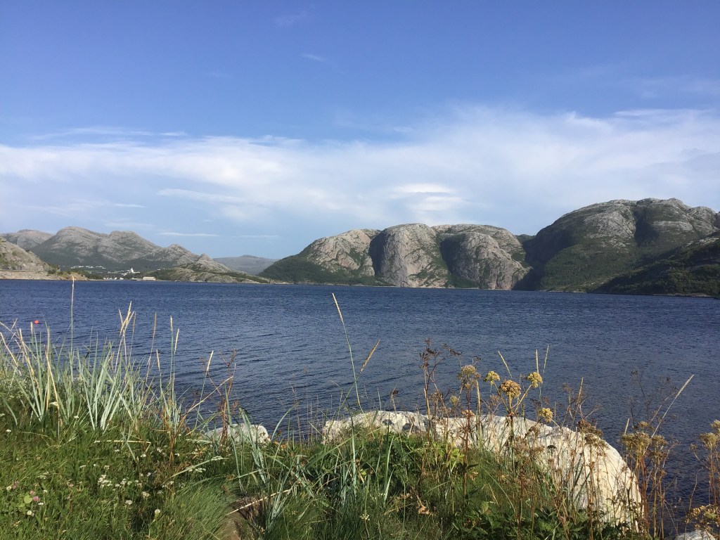 Der Weg führt ins Heute über Nebenstraßen an der Fjordküste entlang bis zur Fähre in Brekstrand. Die Gegend ist äußerst abwechslungsreich und hat Berge, Fjorde und Seen aber auch landwirtschaftlich genutzte Wiesen und Felder. Überall auf den Wiesen liegen bunte „Sitzkissen für Riesen“ oder auch Siloballen genannte Rollen. Die Gerste beginnt hier stellenweise gelb zu werden. Dann kommt wieder ein großes Waldstück… Leider keine Elche in Sicht.