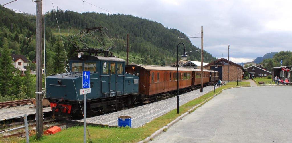 In Løkken gibt es eine alte Mine und um das Erz zu befördern hat man eine Eisenbahnlinie gebaut. Diese Bahn wurde 1908 als erste elektrisch betriebene in Norwegen in Betrieb genommen. Als die Mine 1963 schloss, wurde auch die Bahnstrecke stillgelegt. Ab 1983 fahren nun wieder Museumszüge als älteste Wechselstrom betriebene Schmalspurbahn der Welt. Da auch Lina gern Zug fährt, müssen wir das heute unbedingt machen. Also fahren wir die 15 km bösen Schotterweg zurück auf die RV65 und dann nach Løkken Verk. Der Zug steht schon im kleinen Bahnhof.