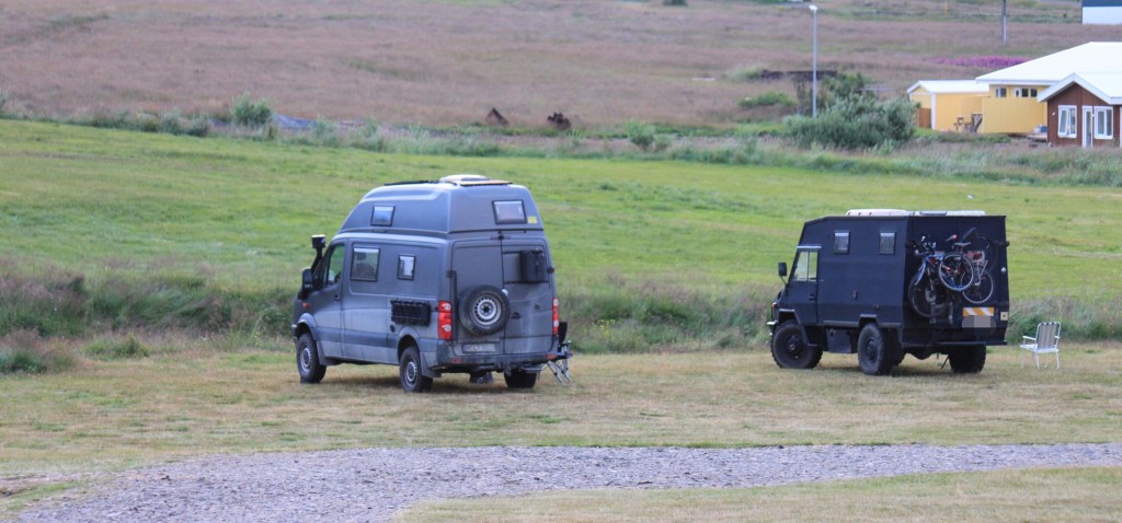 Per WhatsApp verabreden wir uns dann noch mit Susana und Alejandro auf dem Campingplatz in Bakkagerdi. Unser erster Campingplatz in Island hat eine Campingküche, Toiletten und Dusche in einem Holzhaus und richtig viel Platz. Hier könnten bestimmt 20 mal so viele Camper stehen als heute. So können wir uns die Plätze aussuchen, stellen uns nebeneinander und planen…