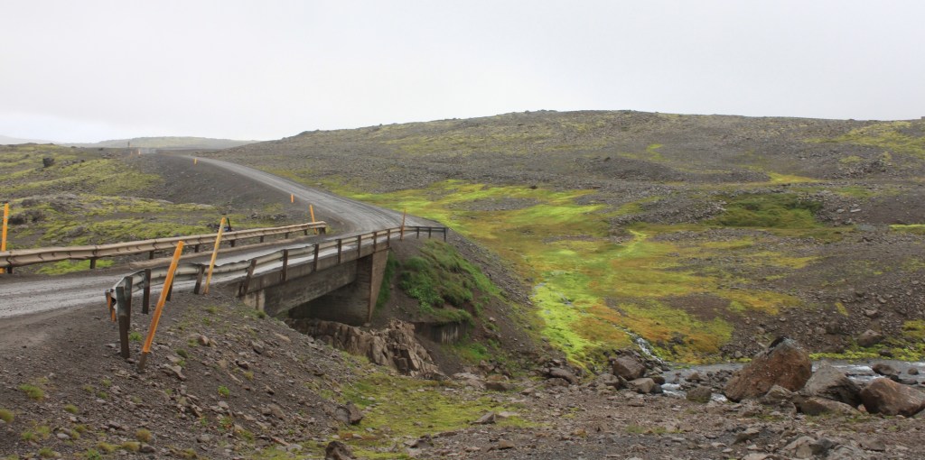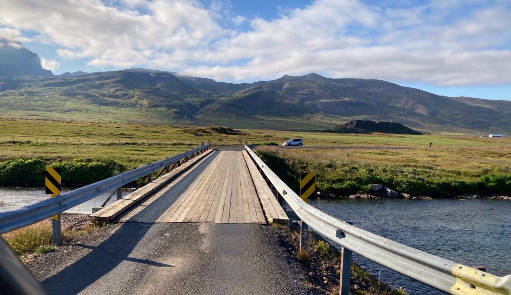 So, nun aber noch in die isländische Natur aufbrechen. Als erstes wollen wir zum Vogelfelsen in Borgarfjördur. Auf dem Weg machen wir gleich mal Bekanntschaft mit den hiesigen Straßenverhältnissen. Hauptstraße heißt nicht immer Asphalt, so fahren wir die ersten Schotterstraßen gleich an unserem ersten Tag. Auch die Brücken sind oft einspurig.
