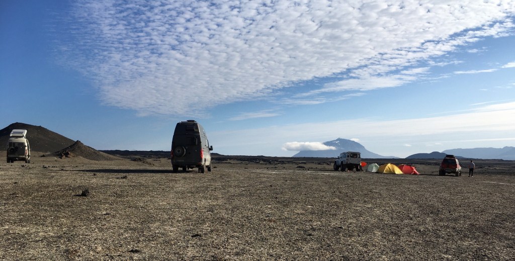 Die Umgebung ist so surreal, es fällt schwer das überhaupt zu begreifen. Wir fahren heute über 100 km Piste durch Asche und Lava, sind die allermeiste Zeit völlig allein in dieser unwirklichen Welt. – Wie auf einem anderen Planeten. – Dann sind wir am Campingplatz (eine Schotterfläche übersäht mit großen Steinen) knapp vor dem Kraterrand angekommen und brauchen erstmal eine Pause. Hier tummeln sich noch ca. 10 andere Geländewagen, es gibt ein Waschhaus, eine kleine Rangerstation und die Basis der Bergrettung.