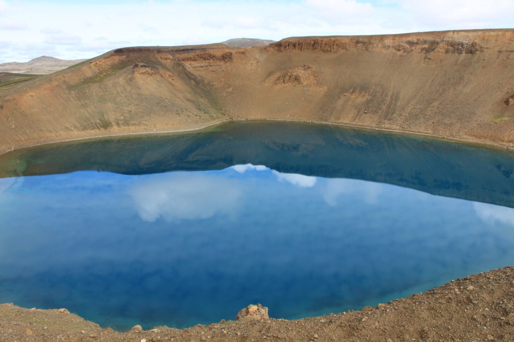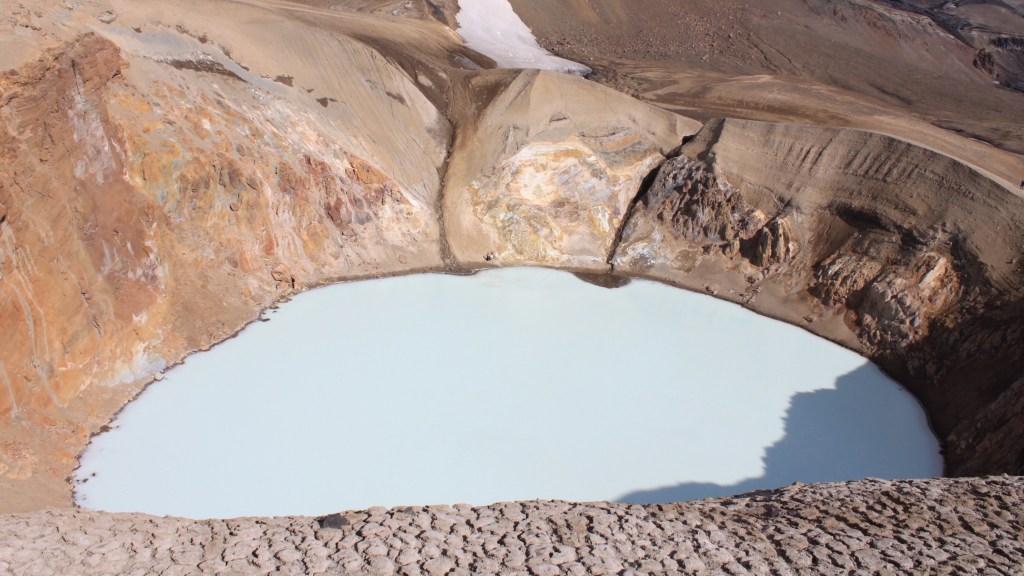 Nach ca. 3 km erreichen wir den ersten kleinen See, den Viti (dt. Hölle) Krater. Zuvor konnte man ihn bereits deutlich riechen. (Wo der Teufel zu Hause ist, richt’s nach Schwefel.) Durch einen Zulauf von Schmelzwasser wird er soweit runter gekühlt, dass man darin baden kann. Der Zugang ist aber sehr steil und rutschig. Die Fabe ist tatsächlich so…