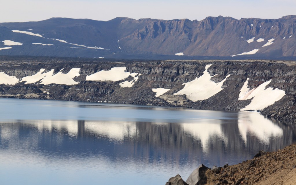 Ein kleines Stück weiter liegt dann der um ein Vielfaches größere Öskjuvatn. Teilweise steigen Dampfschwaden im Uferbereich auf.