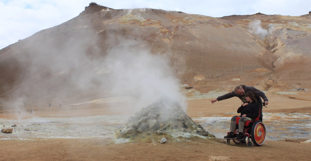 Mehr blubbernde Schlammlöcher, kochende Seen und stinkende Fumarolen finden sich ganz in der Nähe im Hochtemperaturfeld Hverir. Die Wege hier sind bedingt für Rollis geeignet. So kann Lina auch ganz nah dran.