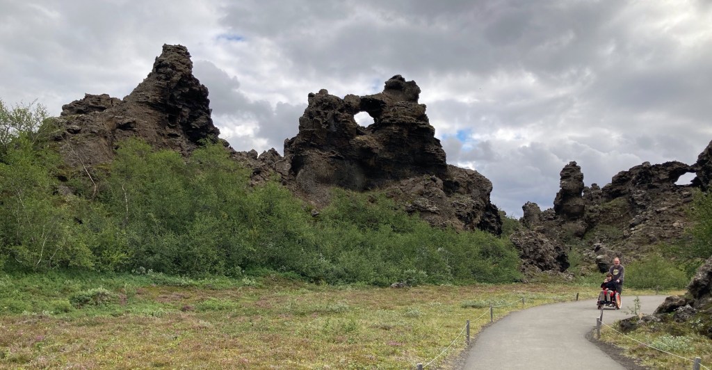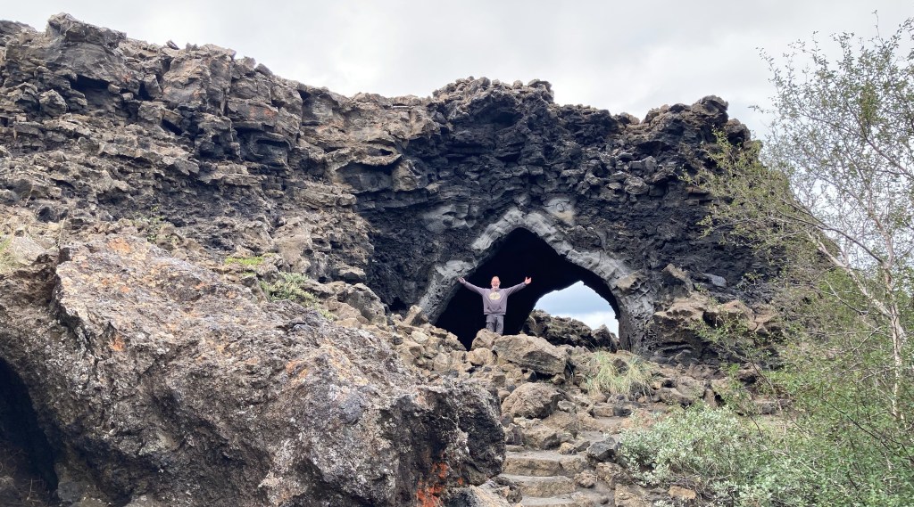 Dann kommt eine Wanderung durch die „Dunklen Burgen“ Dimmuborgir. Hier ist ein Lavafeld über einem Sumpf entstanden und nachdem das Wasser verdampft ist, eingestürzt. Geblieben sind die Säulen. Sehen wirklich aus wie Burgruinen einer dunklen Macht.