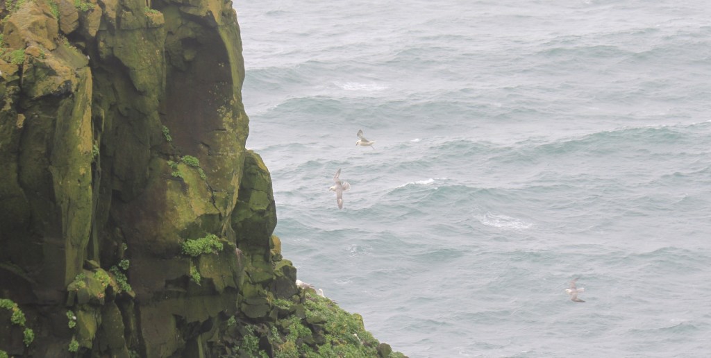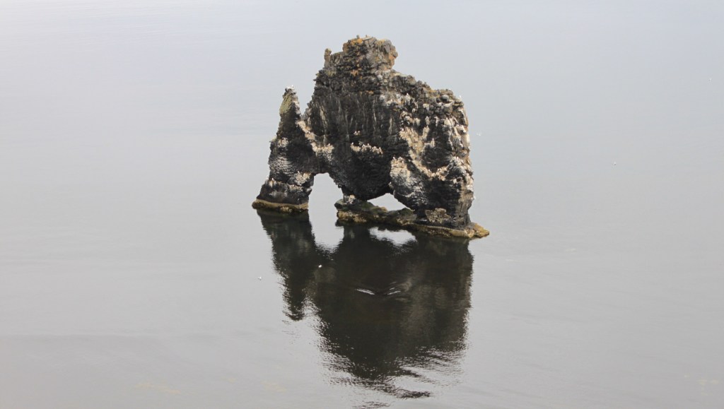 Das nächste Kunstwerk hat die Natur ganz allein geschaffen, der Hvítserkur. Eine 15m hohe Insel aus Basalt. Was man darin sehen möchte, vielleicht ein Seeungeheuer oder ein Nashorn oder…, ist jeder Phantasie selbst überlassen. Die Vögel finden sie prima und nisten in allen möglichen Löchern.