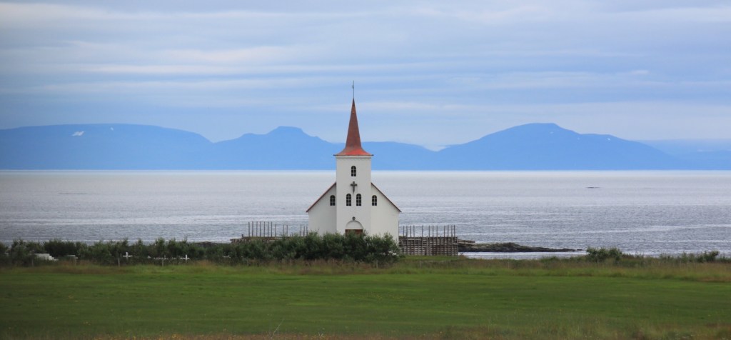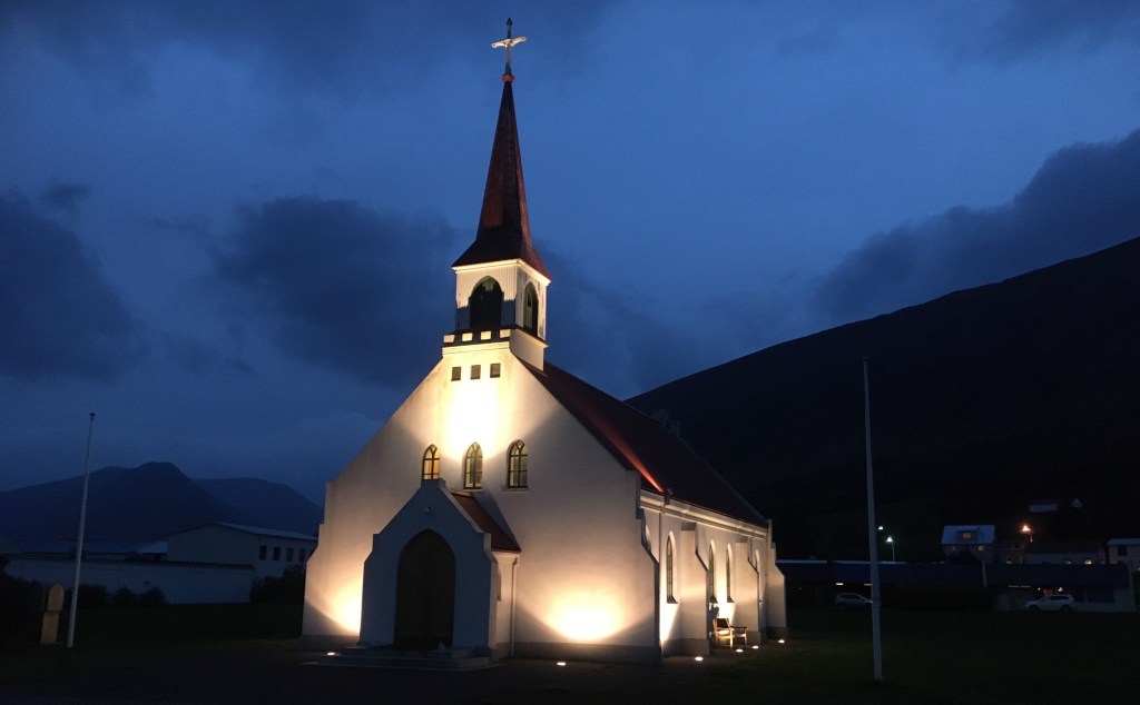 In Þhingeyri treffen wir drei Motorradfahrer , die die F622 rund um die Landzunge zwischen dem Dýrafjörður und dem Arnarfjörður gefahren sind. Sie erzählen, dass es gut geht, man sollte nur auf die Tide achten, da der südliche Teil nur bei Niedrigwasser befahrbar ist. Abends ist die Kirche im Ort schön beleuchtet.