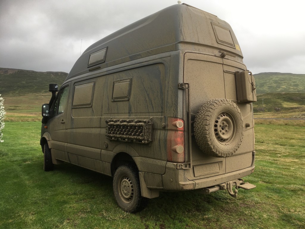 Auf dem kleinen Parkplatz steht auch ein Sprinter mit leicht modifiziertem Fahrwerk. Halt ideal für diese Pisten ausgerüstet.😂