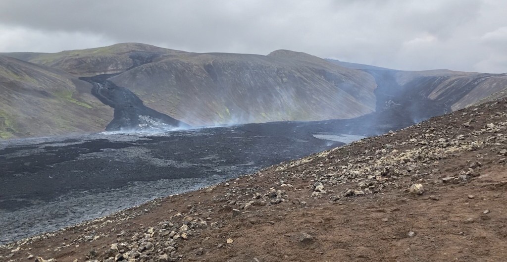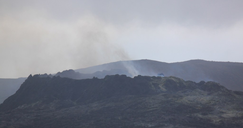 Irgendwie ist heute Ruhetag. Es kommen nur ein paar Rauchwolken aus dem Krater. Die mitgebrachten Brote schmecken trotzdem und tun richtig gut😋. Der Rückweg geht dann viel schneller und die neuen Lavafelder unten im Tal rauchen auch noch.