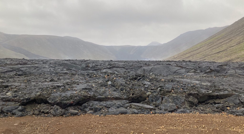Die so etwa 1,5 m hohe, teilweise heiße und qualmende Lavaschicht ist respekteinflößend.