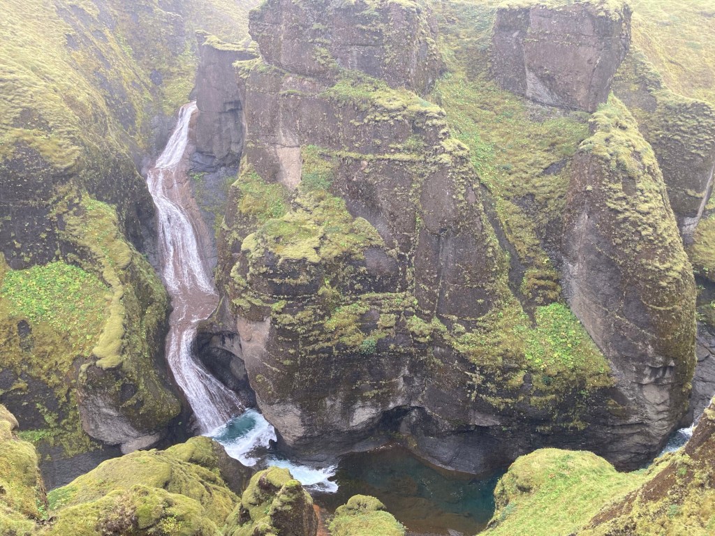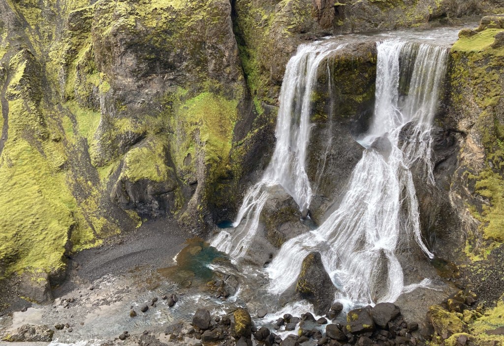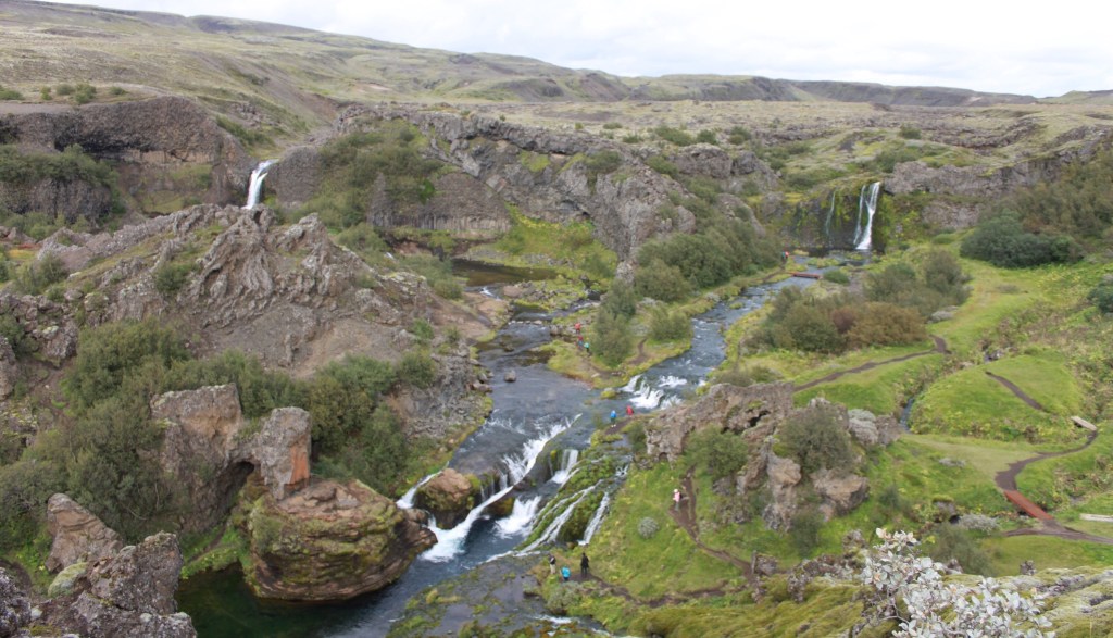 Ein Stück die Piste weiter staunen wir nicht schlecht, als wir die Schlucht um den Wasserfall „Gjárfoss“ sehen. Von hier oben wirkt es, als ob ein Gartenarchitekt am Werk gewesen wäre…