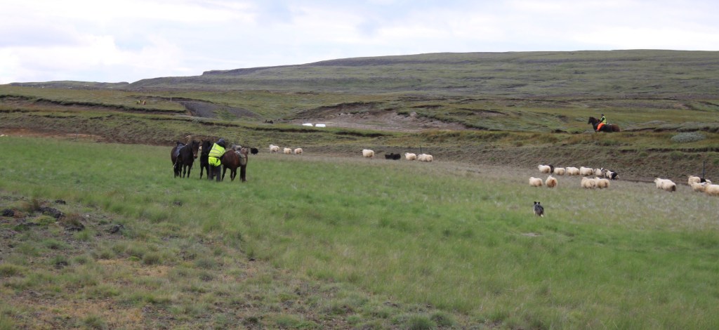 Danach können wir dann noch isländische Schafhalter bei der Arbeit beobachten. Toll, wie die mit Hilfe der Pferde und Hunde ihre Schafe in diesem unwegsamen Gelände zusammentreiben.