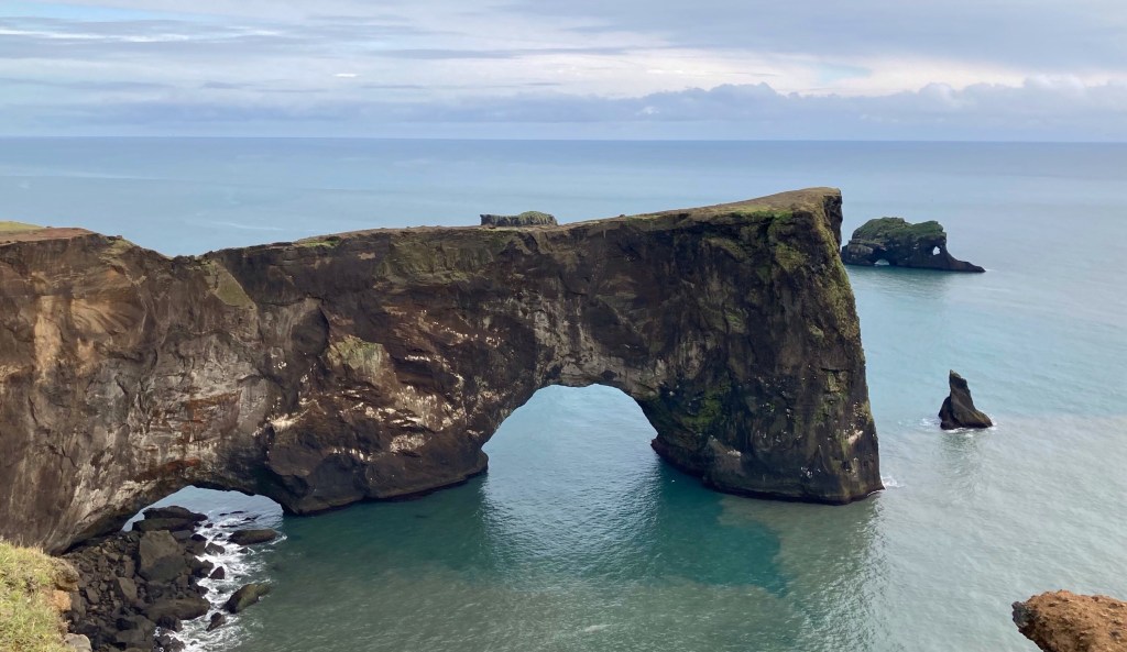 Nach dem Trocknen 😜 fahren wir noch zum Dyrhólaey Aussichtspunkt um uns Felsformationen im Wasser anzusehen. Hier kommen Erinnerungen an Australien hoch. Nicht, dass es so warm ist, aber die Felsentore ähneln stark der London-Bridge-Formation in Victoria/Australien.