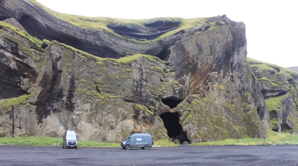Nun sind wir aber mit Martina und Axel an der Hjörleifshöfði hellir verabredet. Dort an der Höhle wollen wir übernachten und morgen eine gemeinsame Tour in die Laki-Region unternehmen.
